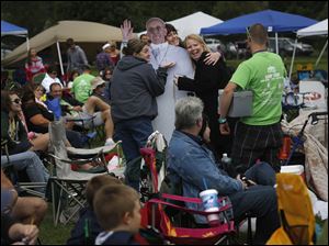 Jorden Lammers of Leipsic, center right, takes a donation for a photograph with a cutout of Pope Francis as the Jacob and Matthew Band preform.