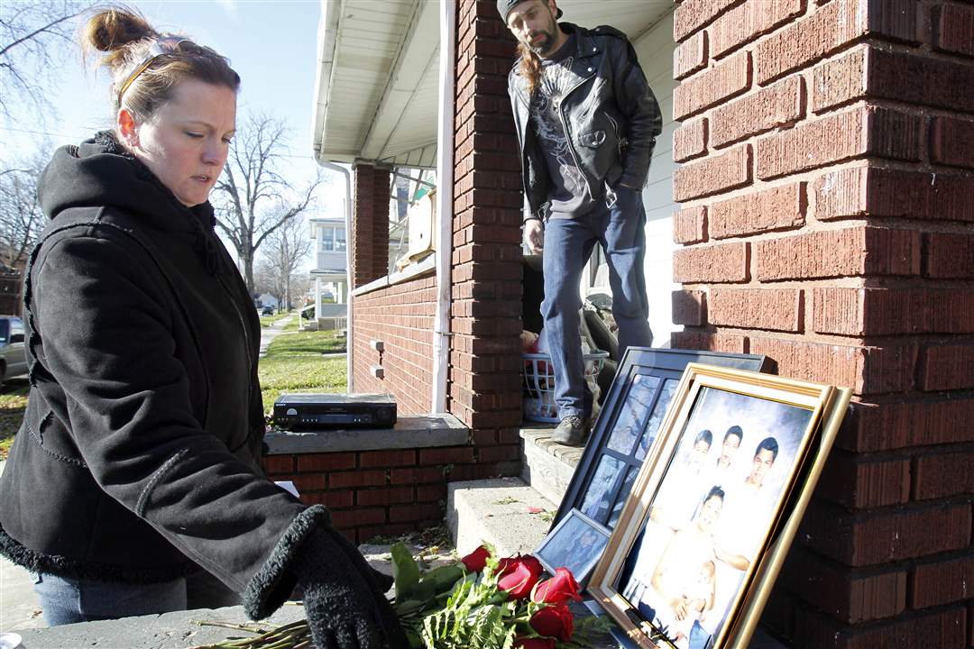 Christina Mahs, left, who has been friends with Veronica Serrano since she childhood, puts red roses in front of several family pictures in honor of her slain friend.