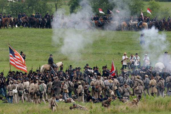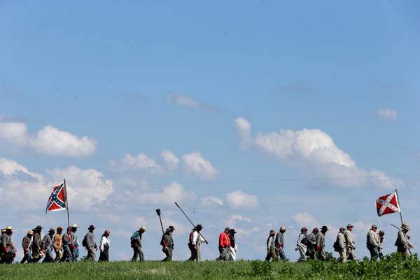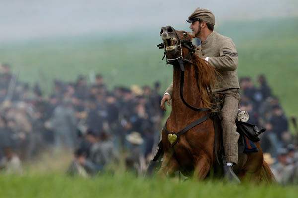 The Blue and Gray Alliance reenact ors do battle depicting the Battle of Gettysburg on July 2, 1863, the Hanover Cavalry Battle Saturday, June 29, 2013 in Gettysburg, Pa. Members of Jeb Stuart's cavalery arrive for the reenactment.