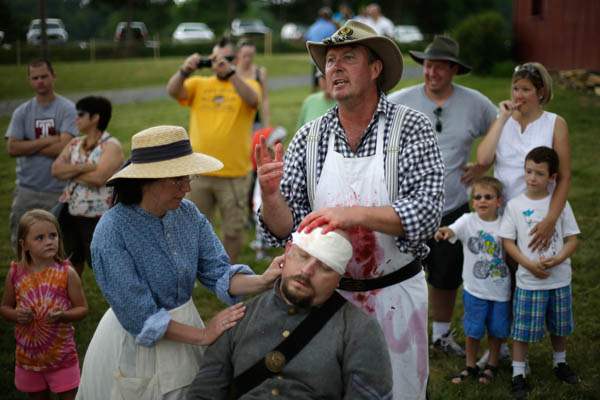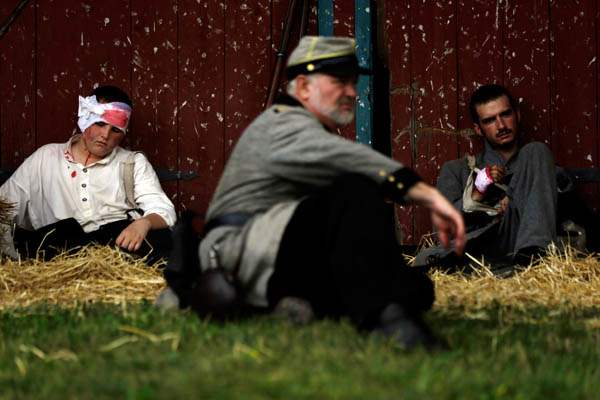 The Blue and Gray Alliance Confederate reenactors H.C. Scott, left, an assistant surgeon and Elvin Schlegel, right, an assistant surgeon, work at the Daniel Lady farm treating wounded soldiers at their field hospital.