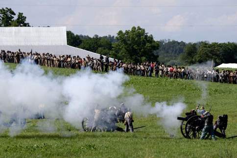 Reenactors take part in a demonstration of a battle during ongoing activities.