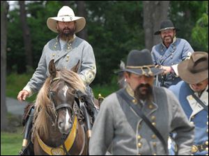 The Blue and Gray Alliance reenactors Gene Pennell, left mounted, protraying Lt. Gen. James Longstreet, arrives at the Danile Lady Far to review wounded troops.