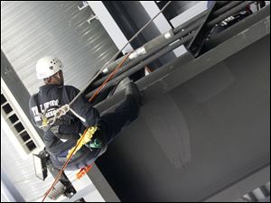 Toledo firefighter Rick Doran of the Toledo Fire and Rescue Department's tactical and high-angle rescue team practices repelling at the Huntington Center in Toledo.