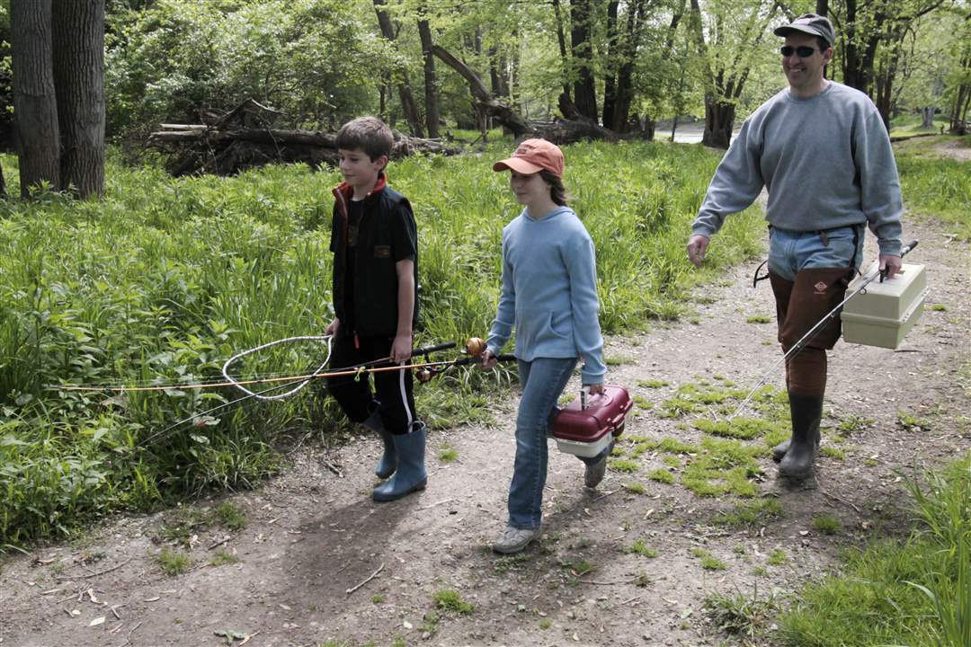 Perrysburg residents Kenton Purvis, 10, left, Melena Purvis, 12, and their dad Kent Purvis exit the park after fishing in a tournament in the Maumee River at Sidecut Metropark in Maumee, Ohio.