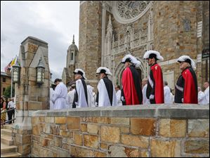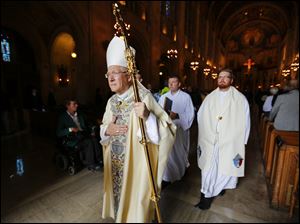 Archbishop Leonard P. Blair heads outside during funeral services.