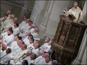 Father James Bacik speaks during funeral services for Auxiliary Bishop Robert Donnelly at Our Lady, Queen of the Most Holy Rosary Cathedral.