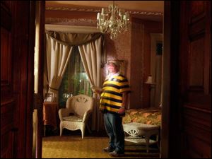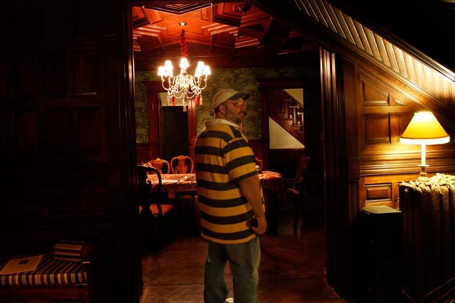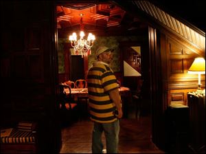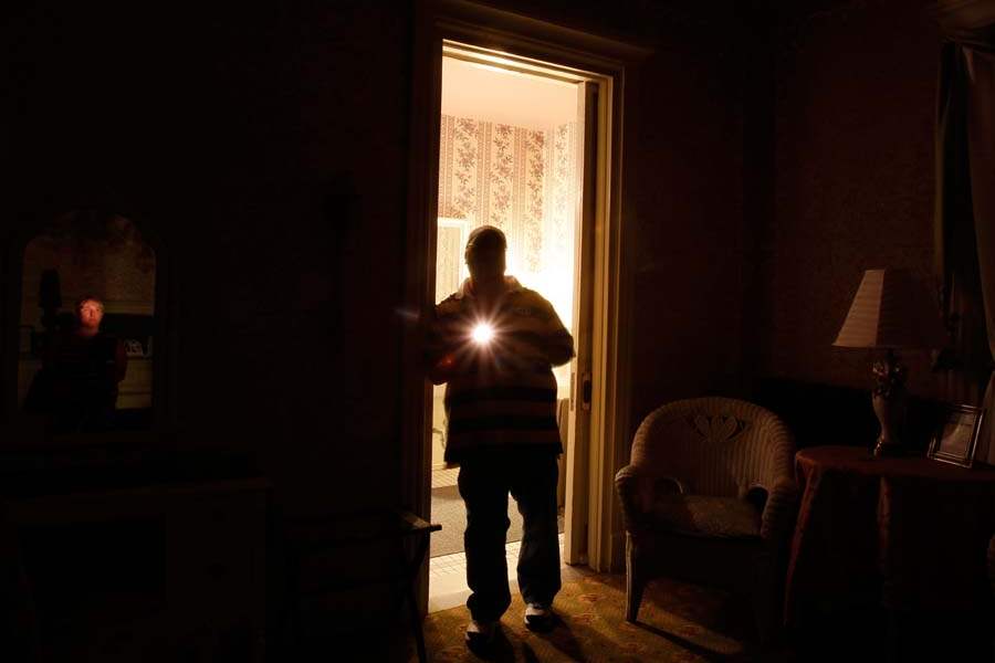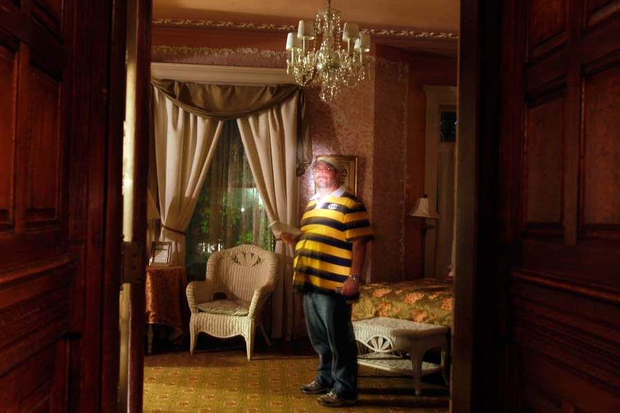 Kirk Baird uses a flashlight to inspect rooms at the Mansion View Inn.
