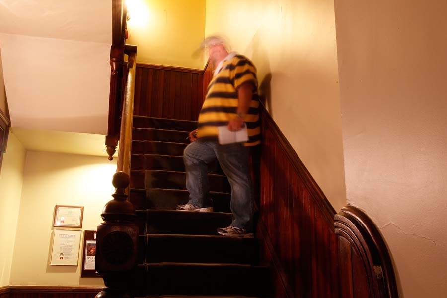 Kirk Baird inspects where an orb of light appeared on the back stairway.