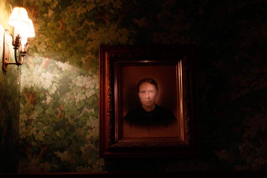 An old painting of an unidentified woman illuminated in the dining room of the Mansion View Inn.