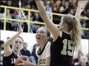 Sylvania Northview's Kendall McCoy (40) takes a shot against Perrysburg's Allex Brown (35) and Maddy Williams (12).