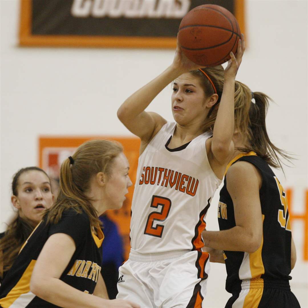 Southview's Lexi Lopez (2) battles Northview's Mallory Small (10) and Maddie Cole (44) for a rebound Saturday, in Sylvania, Ohio.