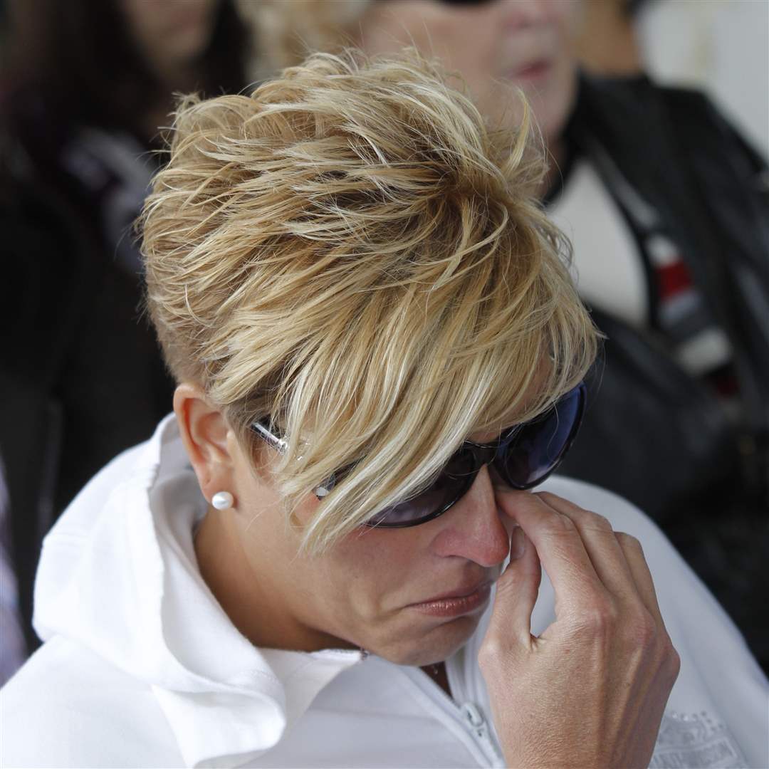 Shonna Burris, wife of Andrew Burris who was killed during the bridge project, wipes away a tear during a dedication for Tribute Memorial Park.