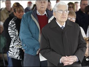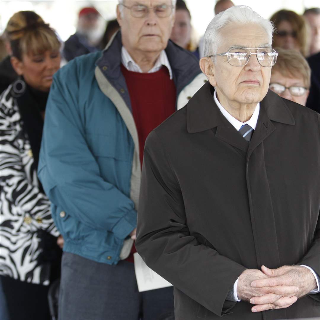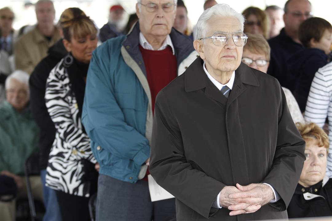 The Rev. Kenneth A. Burris, grandfather of Andrew Burris, stands as the names of Andrew and the four others killed during the construction of Glass City Skyway are read during a dedication for Tribute Memorial Park.