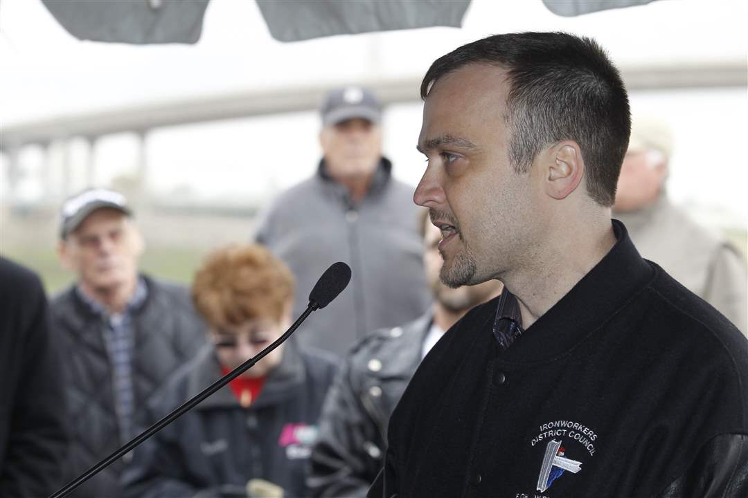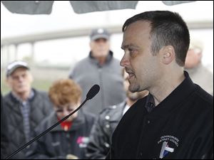Joe Blaze III, of Ironworkers Local 55, speaks during a dedication for Tribute Memorial Park. Five men were killed during the building of the Glass City Skyway bridge over the Maumee River.