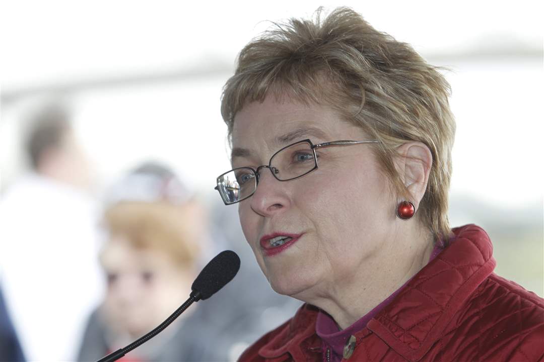 U.S. Rep. Marcy Kaptur (D.,Toledo) speaks at the Tribute Memorial Park dedication in Toledo. She said trade workers risk their lives every day and described the Glass City Skyway as a "great civic cathedral" to the families of the five workers who were killed during its construction.