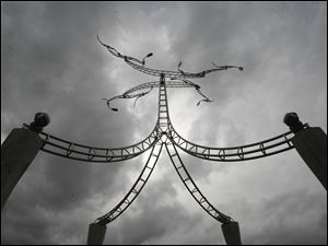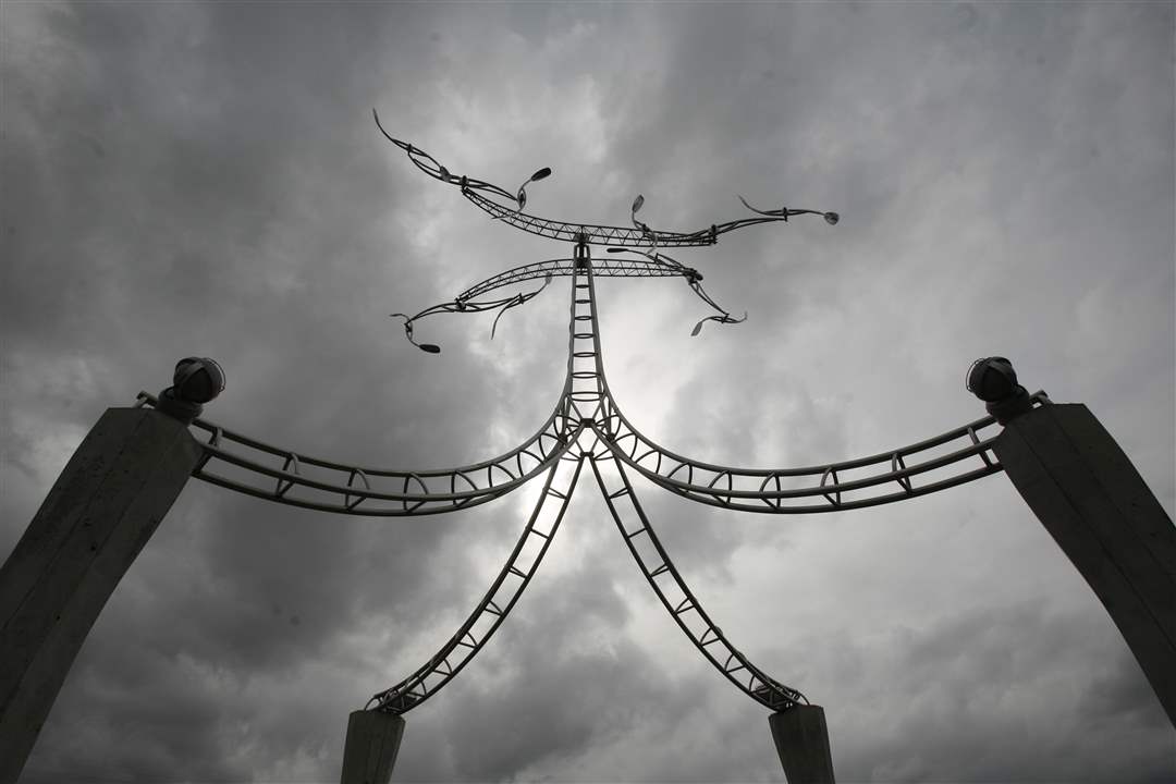 People view a sculpture by artist Evan Lewis at Tribute Memorial Park, which honors those who worked on the Glass City Skyway, including those who were injured and five men who died. The metal artwork sits atop concrete four columns and has arms attached to eight propellers that spin in the wind.
