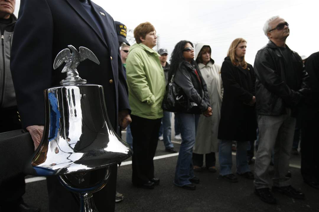 A bell is rung for those killed in the bridge project during a dedication for Tribute Memorial Park.