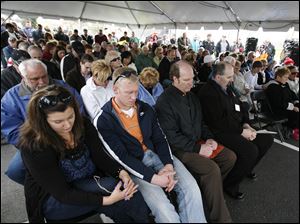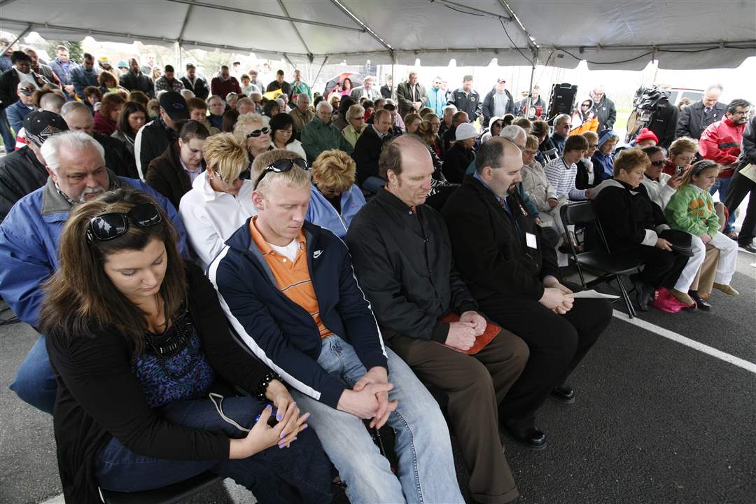 A crowd prays Thursday at the dedication of Tribute Memorial Park, which honors those who contributed to the construction of Glass City Skyway and honors those who were injured and killed in the project.