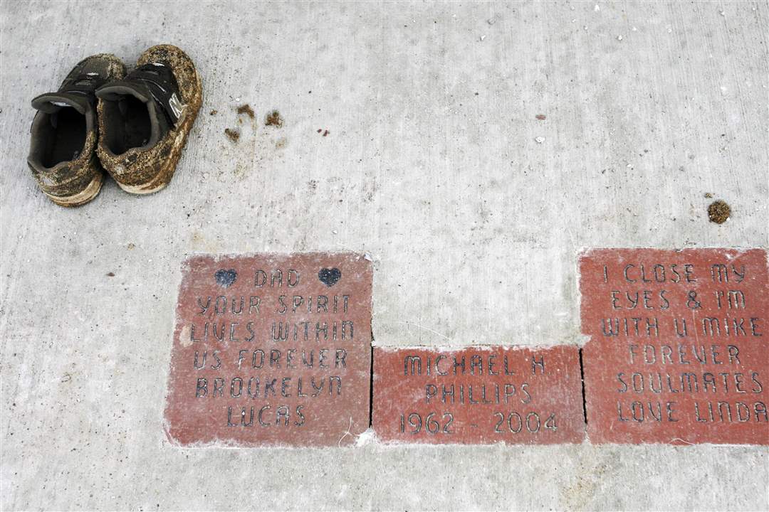 A pair of shoes are left near a bench and bricks dedicated to Michael Phillips at Tribute Memorial Park. Phillips was among five killed during construction.