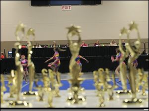 The dance group Infiniti of Oak Harbor performs between the trophies and the judges at the Greater Midwest Cheer & Dance Expo in Toledo.