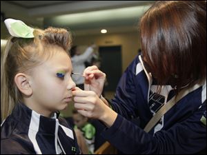 Kayla Knight, 9, of Toledo is readied for performing by a fellow member of the Ohio Elite All Stars, Megan Richardville, 17, of Walbridge. The team is from Milbury.