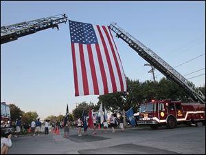 Toledo Firefighters Adam Thal, left, and Steve Swartz connect the U.S. flag to fire truck ladders to display the flag.