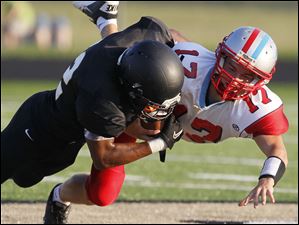 Bowsher quarterback Andrew Grigsby (17) is brought down by Perrysburg's Tyler Gordon (12).
