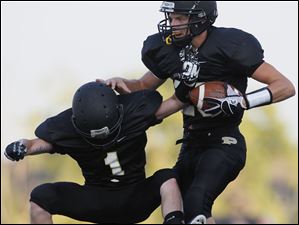 Perrysburg's Steve Slocum (17) returns an interception for a touchdown against Bowsher Friday, 08/26/11, in Perrysburg, Ohio.