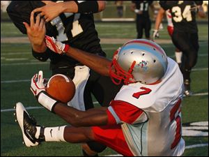 Perrysburg's Steve Slocum breaks up a pass intended for Bowsher's Taylor Richardson (7).