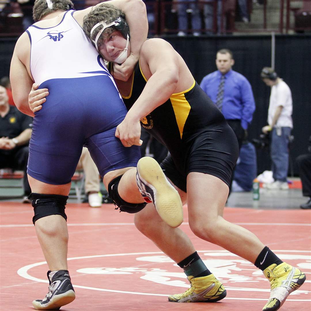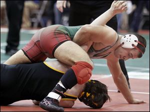 Garrett Gray of Oregon Clay takes on Nate Hoff of Solon in overtime during the Division I 285 pound championship match for fifth place.