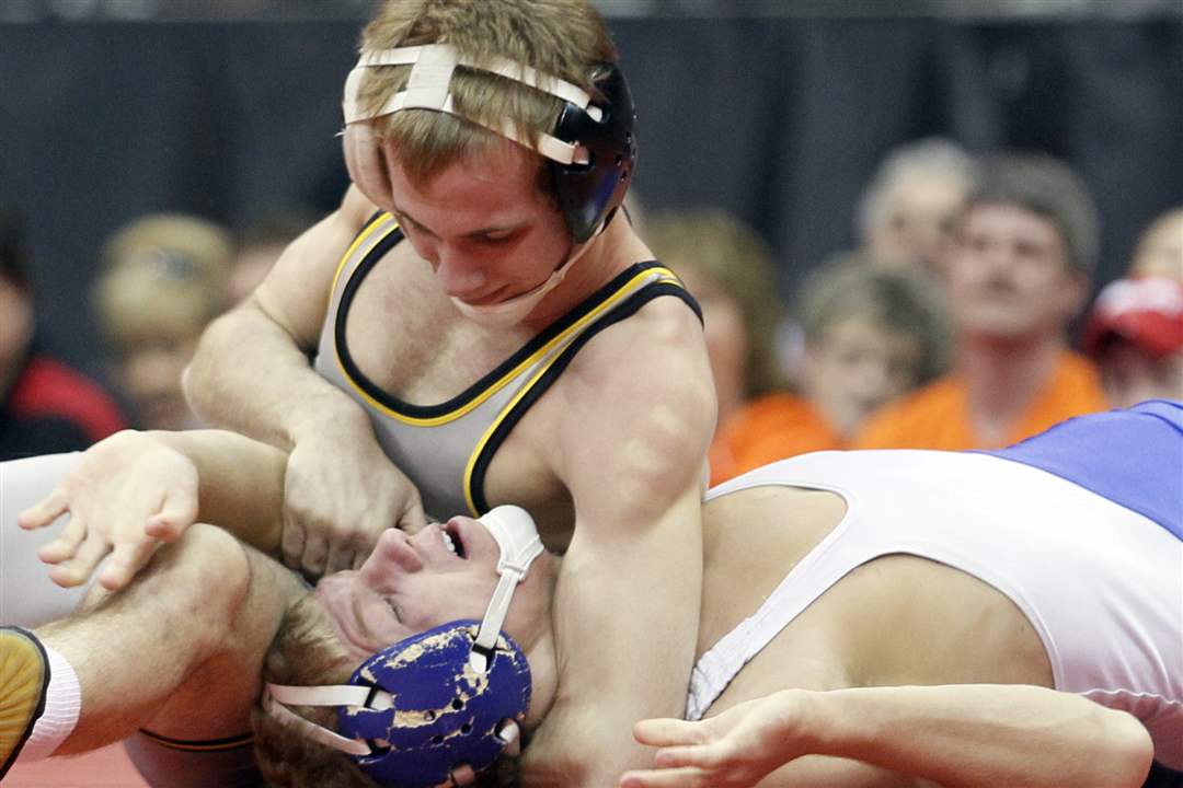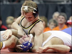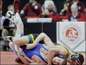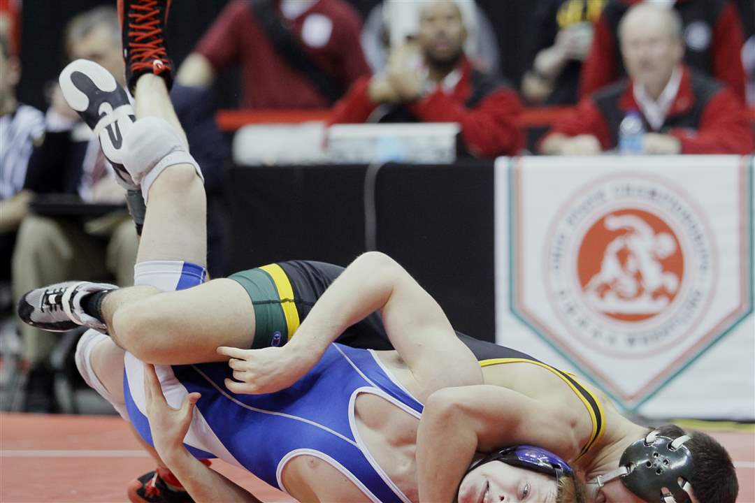 D.J. Recknagel of Rossford takes down Josh Lehner of Lexington during the Division II 189 pound championship match for seventh place. Recknagel lost and placed 8th.