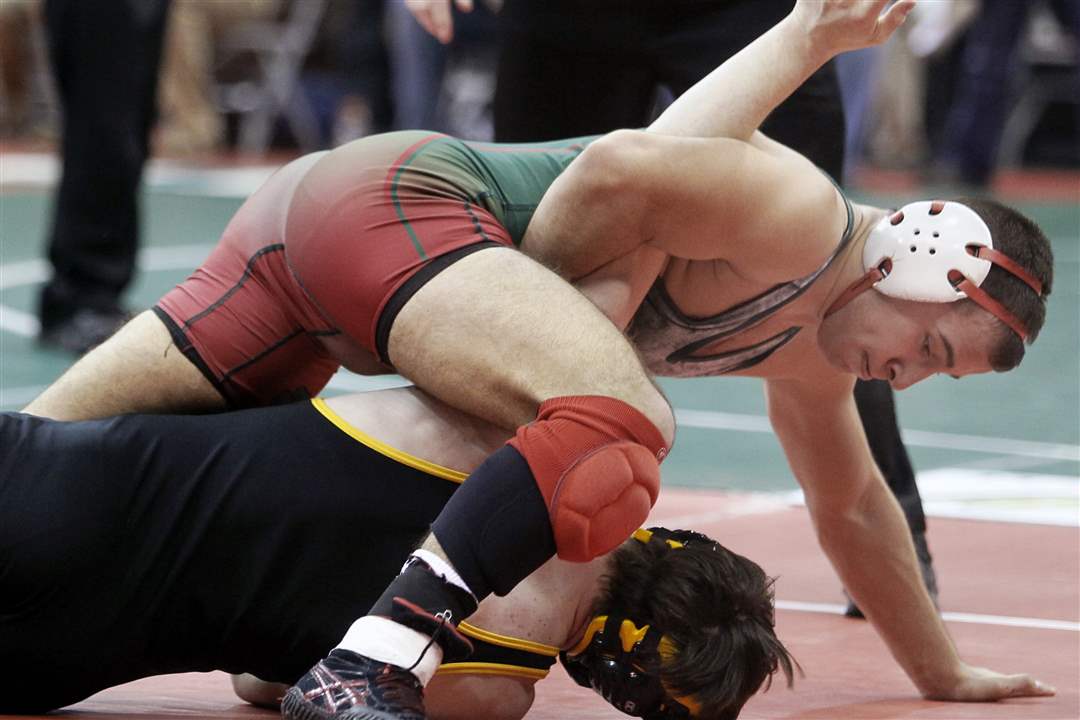 Xavier Dye, bottom, of Patrick Henry is defeated by Cody Walters of Bedford St. Peter Chanel the 160 pound Division III championship match.
