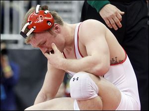 Garrett Gray of Oregon buries his face after being defeated by Nate Hoff of Solon. Gray placed 6th in the Division I 285-pound championship.