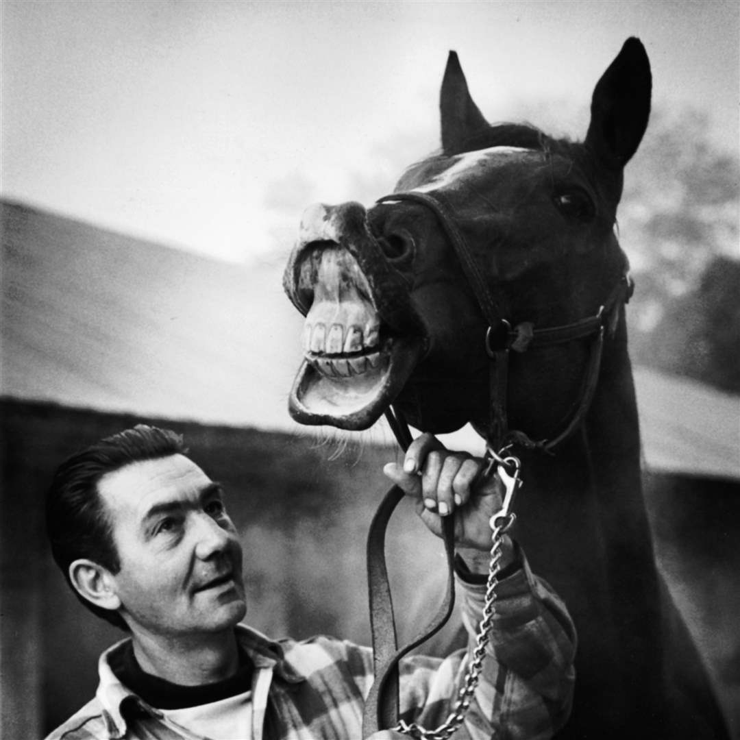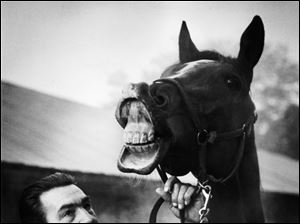 The horse Bookworm "smiles" for the camera with Benjamin Horch on Sept. 25, 1960. The bit of a bridle is not held in a horse's teeth but in the interdental space, an area with no teeth where the bit can rest with the jaw closed.