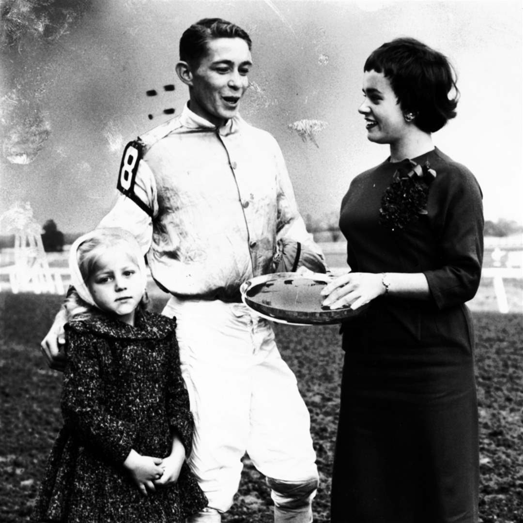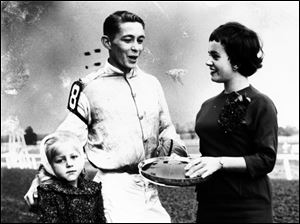 Jeanne Phillips, reigning Miss Toledo, presents an award to jockey Bobby Wall as he stands with young Sue Wankentin on Oct. 27, 1958, at Maumee Downs racetrack.
