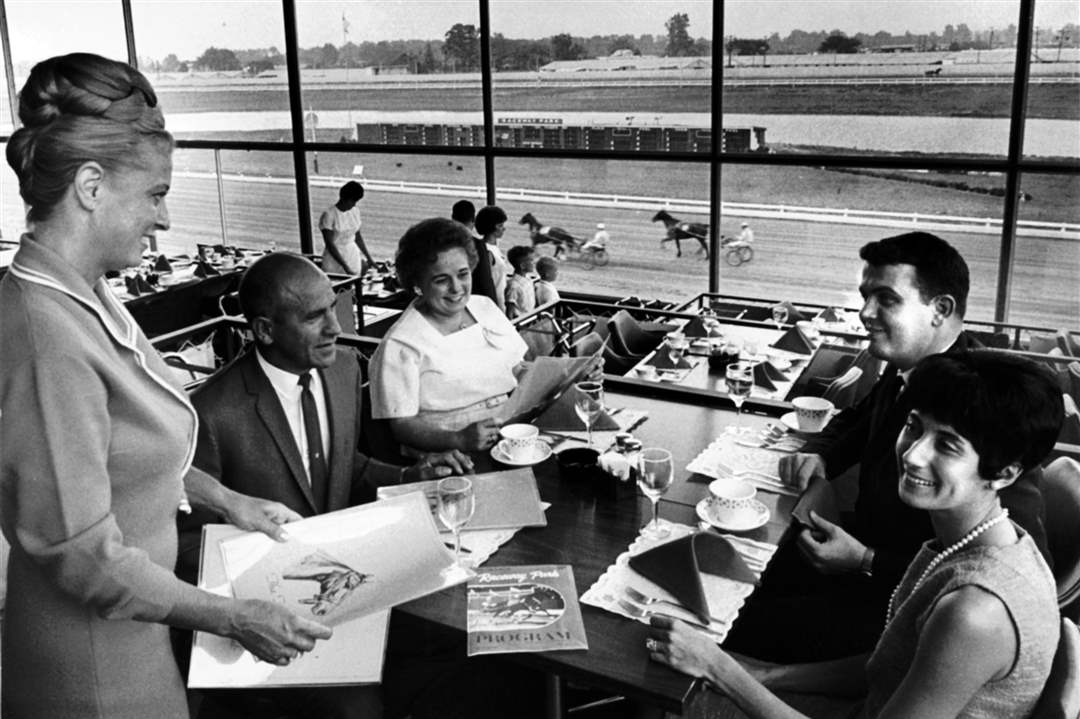 Hostess Irma Lichtenwald greets Mr. and Mrs. Sylvester Hechura and Mr. and Mrs. Jerry Monalian on July 7, 1967, at Raceway Park as the couples prepare to enjoy a meal in the Turf Club with an open view of harness racing on the track.