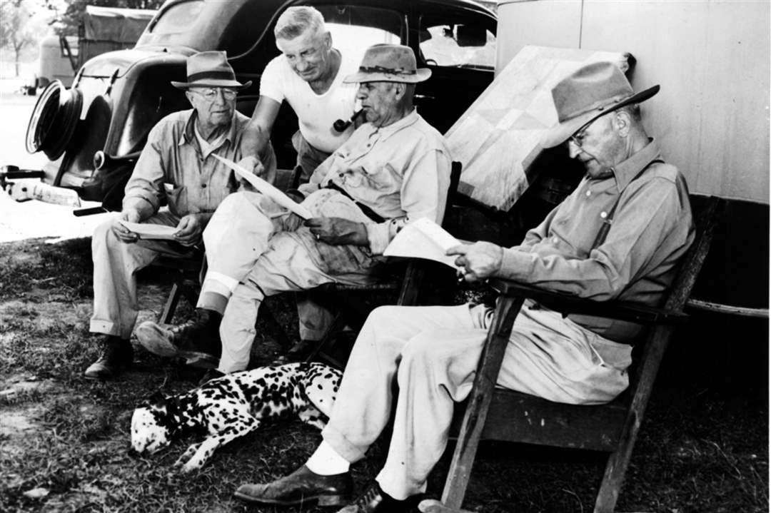 Looking over the race forms for a Sept. 21, 1947, race at Fort Miami include Frank Morris of Celina, Ohio, Jimmie Carroll of New York City, and Harry Gray and Billy Morrow, both of Toledo. Morrow's dog Killey, an 8-month-old Dalmation lying next to his rocking chair, is a companion of the horse Duke of Kent.