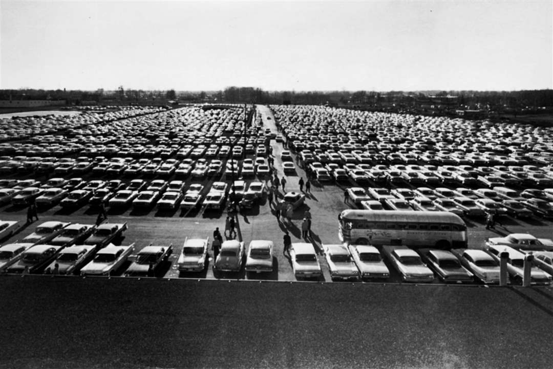 Raceway Park's parking lot is at capacity on the evening of April 9, 1962, as spectators come to watch the horses run. The decade before, the cars were the thing to watch on the track as Raceway Park was opened in 1949 for stock car racing.