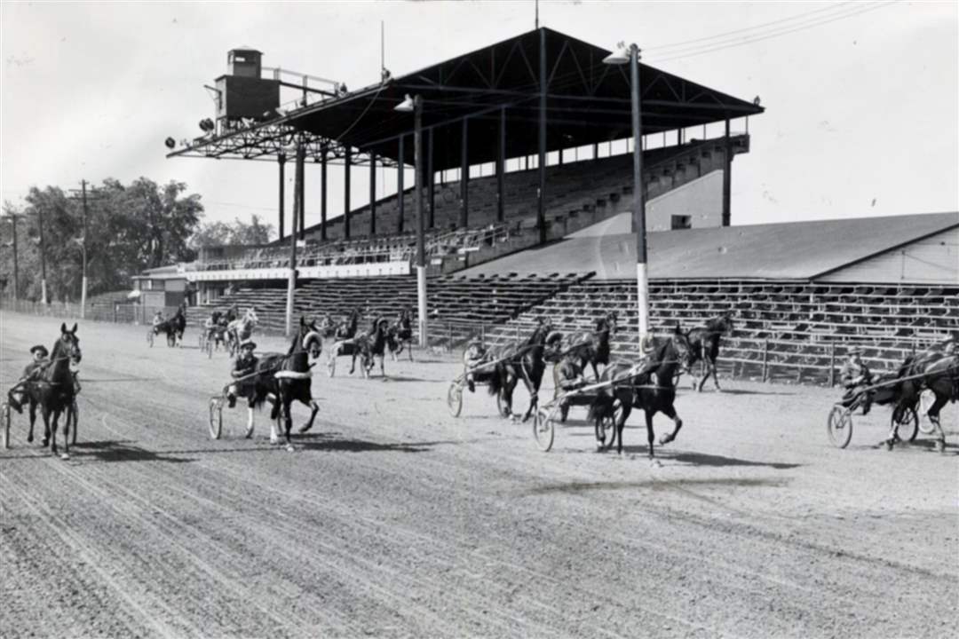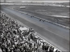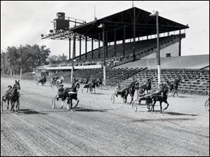 Trotters and pacers get in final workouts June 6, 1947, before the opening of a four-week harness racing program at Fort Miami. The standard breds can be seen coming down the stretch in front of the grandstand in a morning drill. The site, which later became Maumee Downs, is now the location of the Lucas County Fairgrounds.