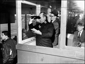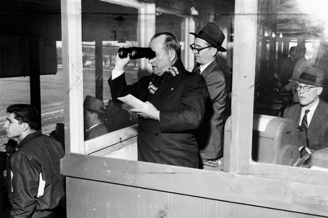 Chart-caller J.J. Hahn peers through field glasses at the track as Tom Mulligan stands nearby and Harland Smith, right, sits at the Teletype machine in the call booth at Maumee Downs.