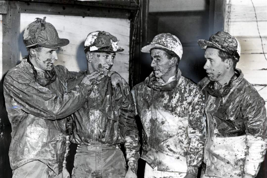 Mud-spattered jockeys, from left, J. Baird, J.M. Wagner, A. Martinez, and W.D. Lucas get their picture taken after the second race April 23, 1952, at Fort Miami racetrack.