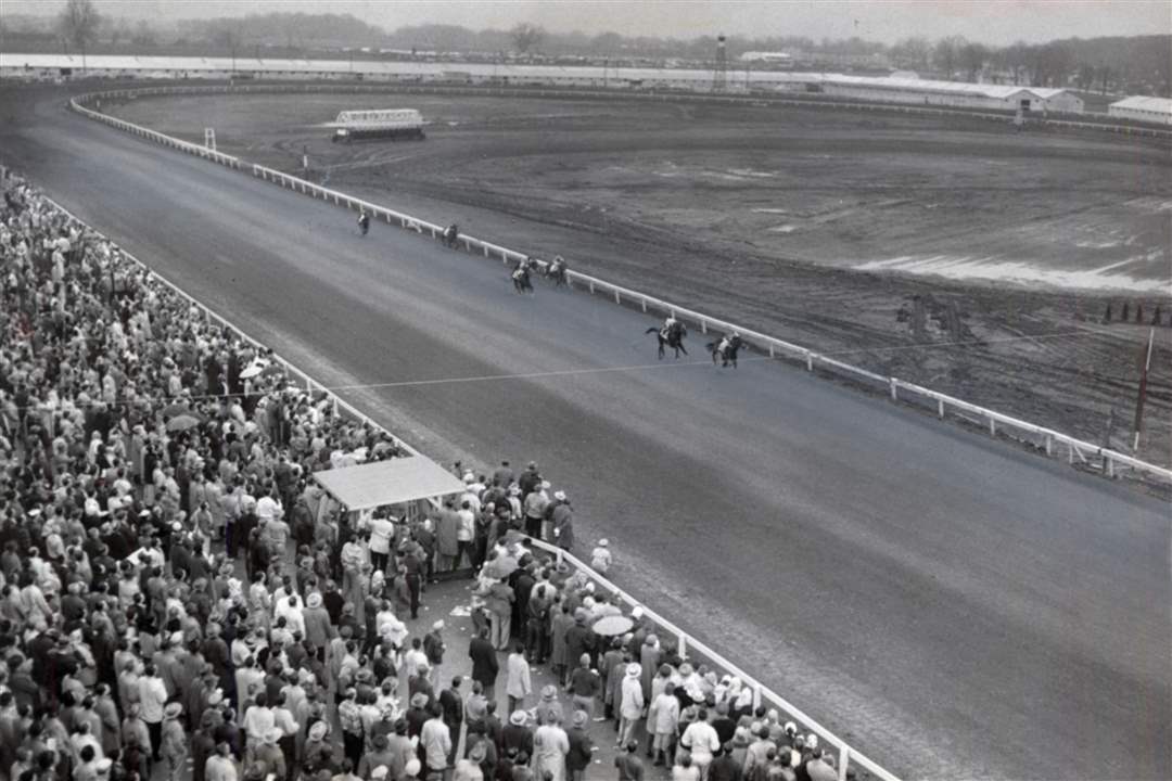 The crowds at Raceway Park watch horses come down the home stretch on April 4, 1960. Thoroughbred racing was expensive to maintain and more vulnerable to weather, such as creating soft spots in the track, so by 1973 Raceway Park was offering only harness racing. The sulkies were still circling the track there in 2011.
