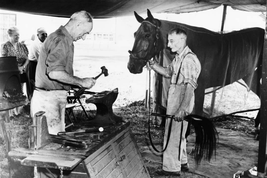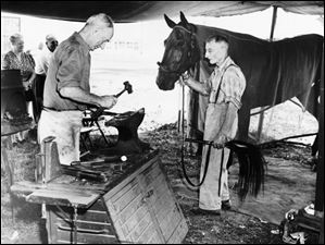 Fans were invited behind the scenes at the local tracks to view the horses before post time, which some used as an opportunity to judge how a horse might perform and thus how to wager. On Sept. 21, 1947, at Fort Miami, farrier James Windsor of Bellefontaine, Ohio, works on a shoe for Abby, an 8-year-old gelding of C.A. Faulters of Sidney, being held by the harness by caretaker Martin Houstin of Ulrichsville, Ohio.