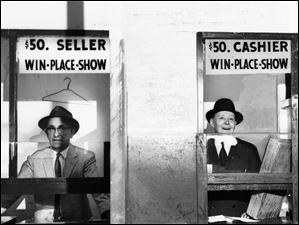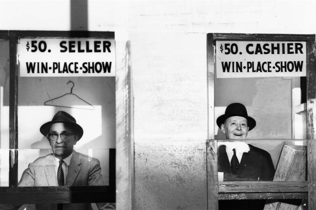 Tellers Bill Pote, left, and Neil Sullivan stand at the wagering windows May 14, 1959, at Maumee Downs. Bets to "win" mean the horse must come in first; "place," first or second; and "show," first, second or third.