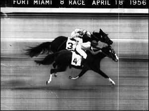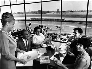 Mr. and Mrs. Carl J. Schroder of Findlay peruse the racing form April 2, 1957, at Fort Miami. Retired Blade sportswriter Seymour Rothman said people "made a real evening of it" by coming to the track to eat dinner, walk through the paddock, stay for all the races, and place bets.
