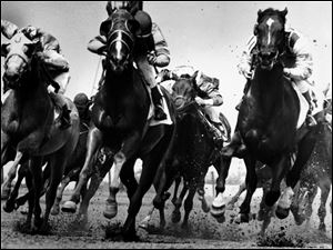 These horses and jockeys, running at Raceway Park on Oct. 24, 1983, are part of the more than century-old tradition of horse racing in the Toledo, Ohio, area.