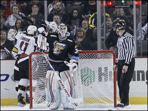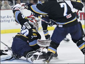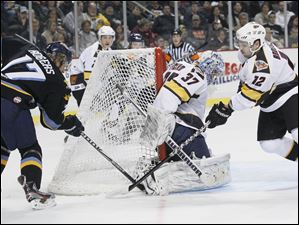 Toledo Walleye player Kyle Rogers, 17, tries to dig the puck from the pads of Cincinnati Cyclones goalie Chet Pickard, 37, as Ryan Annesley, 12, moves in.