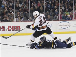 Toledo Walleye player Matt Krug, 7, makes a diving block as Cincinnati Cyclones player Justin Vaive, 24, skates the puck in.