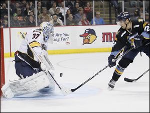 Walleye player Aaron Lewicki, 12, tries unsuccessfully to get the rebound past Cincinnati Cyclones goalie Chet Pickard, 37.