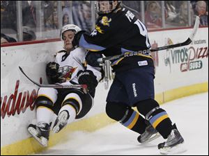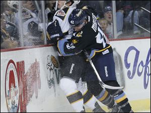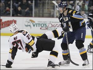 Walleye player Kyle Page, 4, flattens Cincinnati Cyclones player Anthony Luciani, 26, during the second period.